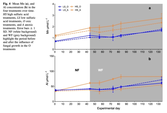 研究意義:比較其他金屬的遷移模式,顯示高硫酸鹽和無氧條件也增強Mn和Al釋放,驗證酸度對金屬溶解的普遍影響。數據來自Fig. 4。