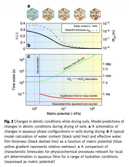 2. 物理化學過程的時間尺度數(shù)據(jù):模型分析干燥過程中氣體交換、擴散和反應的時間尺度(Fig. 2c)。研究意義在于揭示水膜變薄時擴散成為限制因素,導致化學物質(zhì)局部積累和pH異質(zhì)性,解釋排放動態(tài)。