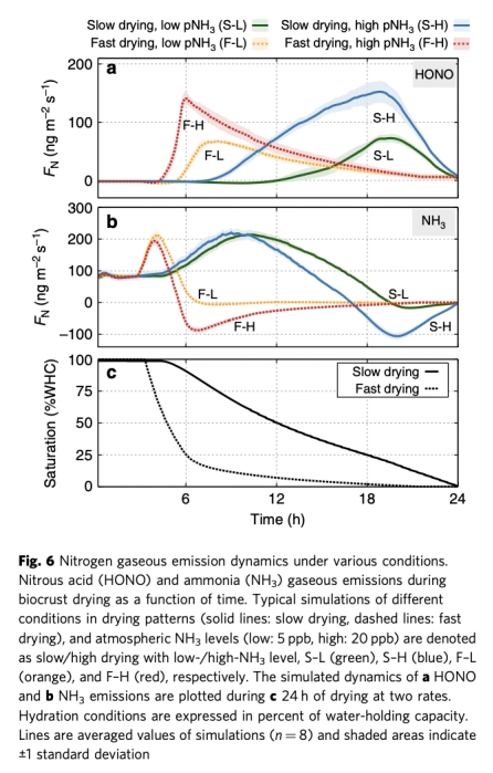 5. HONO和NH3排放預測數(shù)據(jù):模型模擬干燥生物結(jié)皮的排放動態(tài),顯示HONO和NH3排放峰值在特定水含量處出現(xiàn),并受干燥速率和大氣NH3水平影響(Fig. 5, Fig. 6, Fig. 7)。研究意義在于量化環(huán)境條件對排放的影響,為減排策略提供理論依據(jù)。