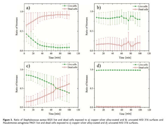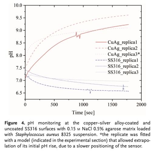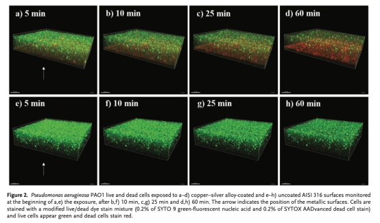 這篇論文摘要闡述了研究團隊成功證明了銅銀合金涂層在模擬干燥表面生物膜形成條件下的抗菌效力,按照美國EPA測試方法,在24小時內對測試菌種的減少率≥99.9%。研究設計了一種定制的共聚焦成像方案,用于原位觀察銅銀合金表面細菌生物膜的殺滅過程并監測其100分鐘內的動力學。銅銀合金涂層在5分鐘內即可根除革蘭氏陽性菌生物膜,而對革蘭氏陰性菌生物膜的殺滅速度較慢。原位pH監測表明,在金屬表面與細菌生物膜界面處pH值升高了2個對數單位;然而,在緩沖液中測試時,細菌的存活率并未直接受到此pH升高(pH 8.0-9.5)的影響。因此,在環境條件下,電化學活性表面與細菌生物膜相互作用導致的OH-生成,是銅銀合金涂層接觸介導殺滅的一個方面,而非觀察到的抗菌效力的直接原因。細菌細胞的氧化、銅離子的釋放以及局部pH升高的結合,共同表征了銅銀合金涂層干燥表面的抗菌活性。