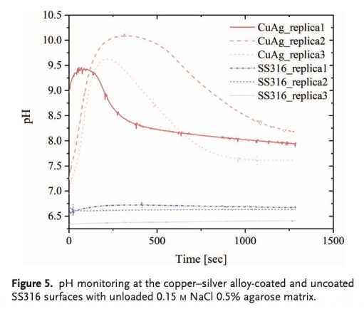 3. 界面pH變化數據:使用Unisense pH微電極測量發現,在金黃色葡萄球菌懸液與銅銀合金涂層界面處,pH以約0.14單位/分鐘的速率上升,20分鐘內達到pH 9.0以上平臺期;而在無細菌存在時,pH先快速升至9.5后因氧化亞銅形成而緩慢下降;不銹鋼對照表面pH則保持穩定或略有下降(圖4, 圖5)。研究意義在于直接證實了涂層表面的電化學活性導致界面局部產生OH-,引起pH顯著升高,明確了這一現象是涂層與細菌相互作用的結果。