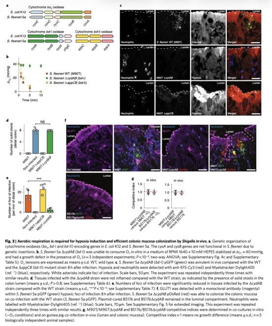 4. 細菌有氧呼吸關鍵基因的功能:通過構建細胞色素氧化酶突變株,評估其體外耗氧能力、生長特性及體內定植和致病力。意義在于在分子水平上確定了bd-I型細胞色素氧化酶(CydAB)是福氏志賀氏菌耗氧和體內缺氧灶形成所必需的,從而將特定分子機制與表型聯系起來。數據來自圖3a, b, c, d, e。