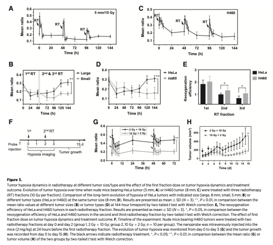 這篇論文摘要闡述了缺氧在腫瘤對放療抵抗中的關(guān)鍵作用,研究放療期間缺氧動態(tài)對改善治療計劃和預(yù)后很重要。作者開發(fā)了一種發(fā)光納米探針(RHyLI),由熒光半導(dǎo)體聚合物和鈀復(fù)合物組成,能在狹窄氧范圍(0-30 mmHg O2)內(nèi)對缺氧細微變化提供高靈敏度和可逆響應(yīng)。靜脈注射后,探針有效積累并分布在腫瘤中,包括缺氧區(qū)域。通過700和800 nm發(fā)射比率進行定量成像,用于分次放療期間7天內(nèi)的腫瘤缺氧動態(tài)成像。結(jié)果顯示,高分次劑量(10 Gy)比低劑量(2 Gy)更有效改善腫瘤再氧合,且效果在較小或更放射敏感腫瘤中持續(xù)更久。第一次分次的再氧合效率對預(yù)測放療結(jié)果很重要。