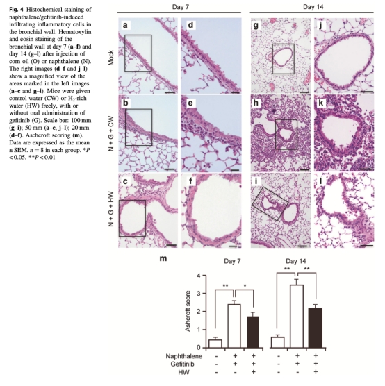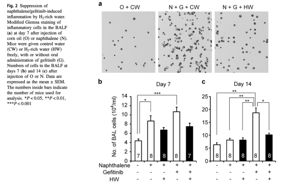 這篇論文摘要闡述了盡管EGFR酪氨酸激酶抑制劑吉非替尼對晚期非小細胞肺癌高度有效,但可能引發嚴重急性間質性肺炎。分子氫作為一種治療性和預防性抗氧化劑,能有效保護小鼠肺免受萘腹腔注射后口服吉非替尼引起的嚴重損傷。自由飲用富氫水減輕了萘/吉非替尼誘導的體重下降,顯著提高生存率,這與肺炎癥和支氣管肺泡灌洗液中炎癥細胞因子的減少相關。萘降低了肺中谷胱甘肽,增加了血漿中丙二醛,并增加了氣道細胞中4-羥基-2-壬烯醛的產生,所有這些都被富氫水緩解,表明富氫水逆轉了氧化應激引起的支氣管壁細胞損傷。最后,氫處理不干擾吉非替尼對體外肺癌細胞系或體內荷瘤小鼠的抗腫瘤作用。結果表明富氫水有潛力通過減輕肺損傷而不損害抗腫瘤活性來改善吉非替尼治療期間的生活質量。