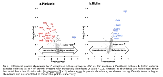 研究思路是使用銅綠假單胞菌臨床分離株,在化學定義培養基(CSP和添加乳酸的LCSP)中培養浮游和生物膜樣本。通過外代謝組學(如HPLC和NMR)測量代謝物濃度變化,并通過無標記蛋白質組學(LC-MS/MS)分析蛋白質豐度差異。比較不同培養條件下碳源消耗順序和蛋白質表達,以驗證反向雙峰現象在生物膜中的存在。