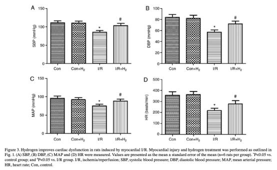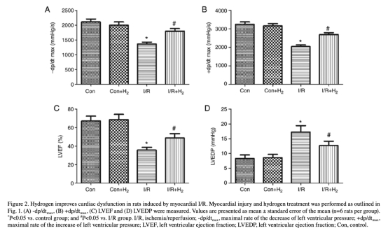 2 心臟功能和血流動力學數(shù)據來自圖2和圖3。研究意義是量化心臟收縮和舒張功能,氫改善±dp/dtmax、LVEF、LVEDP等參數(shù),說明氫能恢復心臟泵血能力。