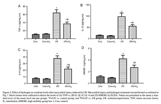 3 細胞因子水平數(shù)據來自圖4。研究意義是評估炎癥反應,氫降低TNF-α、IL-1β、IL-6和HMGB1水平,表明氫具有抗炎特性。