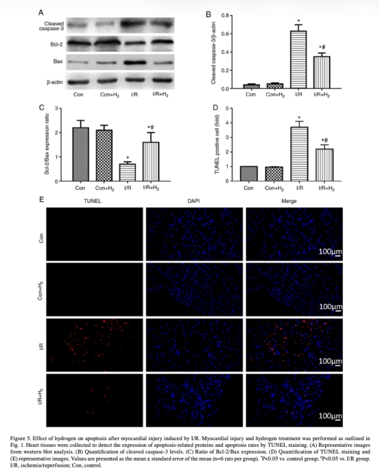 4 凋亡相關數(shù)據來自圖5。研究意義是分析細胞死亡機制,氫減少caspase-3表達、提高Bcl-2/Bax比率和降低TUNEL陽性細胞數(shù),證實氫抑制凋亡。