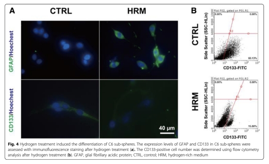 4 GSC分化數據來自圖4,顯示氫處理子代球體后GFAP表達增加和CD133減少。研究意義是證明氫能直接促進GSC分化,減少干細胞群,為機制提供關鍵證據。