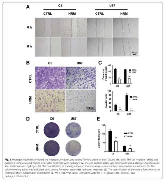 5 遷移、侵襲和集落形成數據來自圖5。研究意義是表明氫抑制腫瘤細胞的惡性行為,減少轉移和復發風險,增強治療潛力。