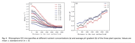 研究中使用了丹麥Unisense的氧微電極和pH微電極測量根際DO和pH微剖面。這些測量數據揭示了根際氧損失(ROL)的動態和微環境變化。具體研究意義包括:量化根際氧通量,顯示ROL隨污染負荷增加而增加,表明植物通過增加氧分泌適應高負荷環境;DO微剖面顯示根際形成氧化區,促進硝化但抑制反硝化,幫助解釋氮轉化空間異質性;pH微剖面顯示根際酸化,可能由于銨吸收和硝化過程,影響微生物活性和氮轉化路徑;這些微電極數據提供了高分辨率時空信息,支持植物-微生物相互作用的機制理解,為優化生物滯留的氧管理和植物選擇提供實踐指導。