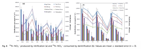 2 硝化和反硝化速率:來自圖6。研究意義:顯示硝化和反硝化速率隨深度增加而降低,根際硝化速率較高,反硝化速率較低,表明根際氧損失影響氮轉化路徑,為優化生物滯留設計提供依據。