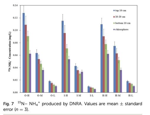 3 15N-NH4+由DNRA產生:來自圖7。研究意義:DNRA貢獻較小,隨深度增加而降低,根際氧損失抑制DNRA,表明在生物滯留中DNRA不是主要氮去除途徑。