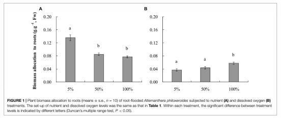 根淹水陸生植物空心蓮子草在營養與溶解氧脅迫下相似的生長性能但對比的生物量分配。