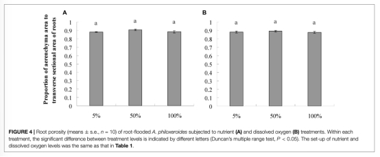5. 根孔隙度和通氣組織通道大?。簛碜詧D4和圖5。研究意義:孔隙度無變化,但溶解氧缺乏時通氣組織通道擴大,增強氣體傳導和氧供應,直接支持根在低氧環境下的營養吸收能力,突出通氣組織形態在脅迫響應中的重要性。