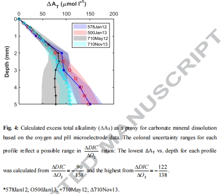 數(shù)據(jù):基于O?和pH微剖面數(shù)據(jù),通過模型計算出的由碳酸鹽溶解產(chǎn)生的“過量堿度”的垂直分布。
