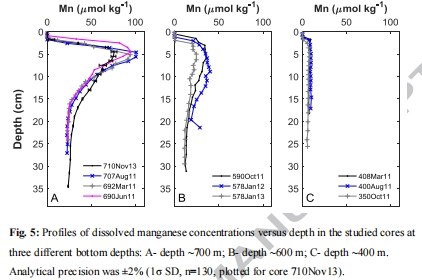 研究意義:提供了溶解發(fā)生的直接形態(tài)學(xué)證據(jù)和長期記錄。電鏡照片清晰顯示,近期沉積的顆石藻化石(特別是1990s-2000s)出現(xiàn)嚴(yán)重的溶蝕和破碎(圖9C, E),而較老沉積中的化石保存較好(圖9K-L)。這直觀證明了溶解事件的存在及其在近代的增強。沉積物錳含量隨深度增加(圖11)與孔隙水Mn2?數(shù)據(jù)吻合,證實了錳的還原-遷移-再氧化/沉淀循環(huán)。