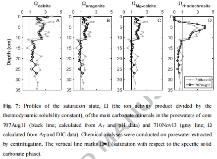 數(shù)據(jù):孔隙水中文石、方解石、鎂方解石、錳錳礦(MnCO?)的飽和度指數(shù)(Ω)垂直剖面。
