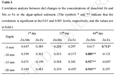 研究意義:揭示了藻華生命過程對Zn遷移的復雜影響。數據顯示,藻華生長期(第1天)Zn白天被吸收,降解期(第44天)Zn夜間大量釋放,并與Mn釋放顯著相關,證實了藻類活動通過改變微環境(耗氧、產生DOM)間接但強烈地驅動了Zn的遷移。