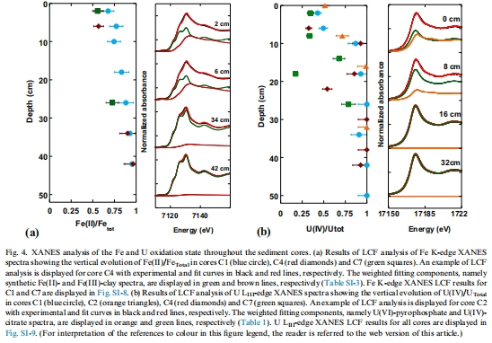 研究意義:提供了鈾和鐵氧化還原狀態的直接證據。數據顯示U(IV)比例從表層~40%增至深層~100%,與Fe(II)比例升高同步,證實了U(VI)還原與Fe(III)還原耦合。這是證明Fe驅動U還原的關鍵證據。