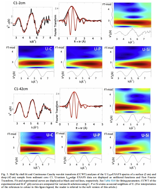 研究意義:揭示了鈾的原子級形態。EXAFS顯示U以單核物種形式存在(缺乏U-U配位路徑),與C、P或Si配體結合,表明鈾并非以晶質鈾石形式沉淀,而是以表面結合或有機絡合的非晶態U(IV)為主。這解釋了化學提取中高比例可提取鈾的原因。