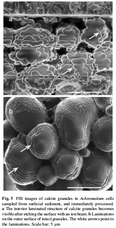 FIB:聚焦離子束切割細胞,觀察方解石顆粒的內部層狀結構(圖5)。