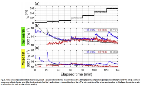 摘要指出,潮間帶頻繁降雨事件在低潮期間會(huì)侵蝕和運(yùn)輸表層沉積物和MPB。本研究通過(guò)Gust侵蝕微宇宙系統(tǒng)(GEMS)進(jìn)行實(shí)驗(yàn),量化了降雨對(duì)鹽沼和混合平坦區(qū)沉積物和MPB可蝕性的影響。結(jié)果表明: