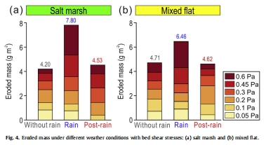沉積物可蝕性:降雨條件下,沉積物可蝕性顯著增加,總侵蝕質(zhì)量比無(wú)雨條件高37-86%,表明降雨擾動(dòng)了表層沉積物。雨后,高可蝕性沉積物被移除,侵蝕質(zhì)量減少。