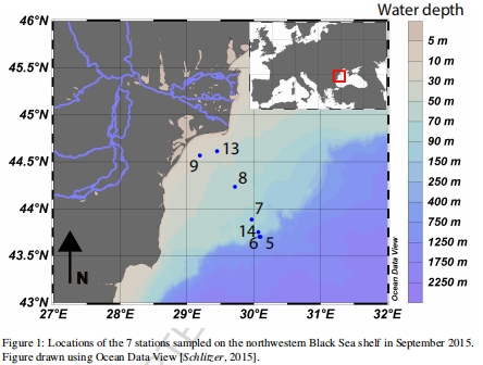 站點設置與采樣:沿黑海西北部陸架水深梯度設置7個站點(圖1),覆蓋沿海(站點9、13)、開放陸架(站點8、7)和陸架邊緣(站點14、6、5)。2015年9月使用R/V Pelagia進行采樣。