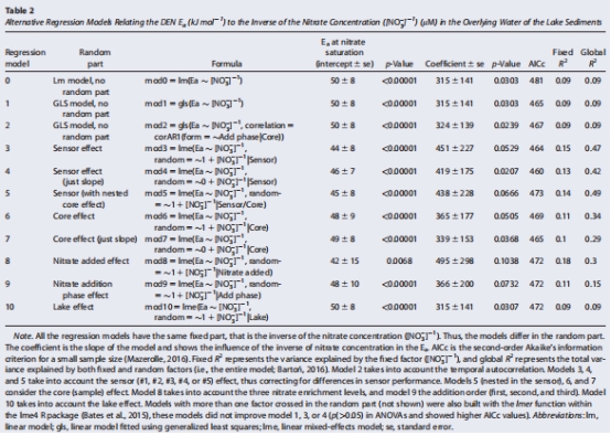 數據分析:使用線性混合效應模型(R包nlme和lme4)評估Ea與[NO?]?1的關系,校正傳感器、巖心、湖泊等隨機效應(表2)。