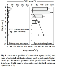 數據內容:孔隙水NH??濃度(C. plumosus:~7 μM全剖面;C. insidiosum:表層12.1 μM,深層188.3 μM)、潛在硝化速率(C. insidiosum表層峰值498 nmol cm?3 h?1)。