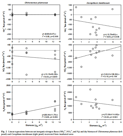 數據內容:C. plumosus生物量與N?通量正相關(r2=0.65),C. insidiosum生物量與1?NO??外排正相關。