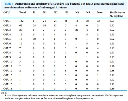 普遍存在:M. oxyfera-like細(xì)菌在所有區(qū)(根際、近根際、非根際)均被檢測到,16S rRNA基因序列歸屬于16個(gè)OTUs。