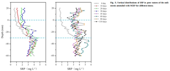 核心孵化實驗:在110天孵化中,NCSP覆蓋導致上覆水SRP濃度最高增加145%(Fig. 3),孔隙水SRP和DGT不穩定磷在表層沉積物(0-30 mm)分別增加176%和193%(Fig. 5和Fig. 6),且無顯著磷形態轉化(Fig. 4)。