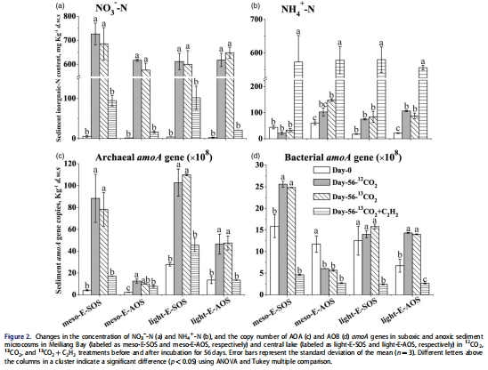 研究了太湖淡水沉積物中活性氨氧化微生物(氨氧化古菌AOA和氨氧化細菌AOB)對富營養化和氧狀態的響應。通過DNA穩定性同位素探針(SIP)和分子生物學方法,關鍵發現包括: