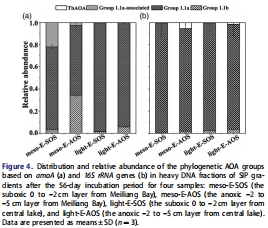 數據內容:13C標記的amoA基因在CsCl梯度“重”分數中富集,表明自養活性;AOA在中等富營養化缺氧層標記較少,AOB在輕度富營養化低氧層標記較少。
