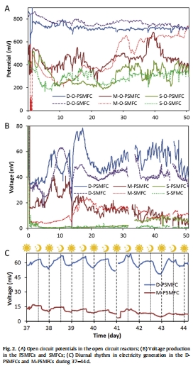 解釋晝夜節(jié)律:晝夜氧氣濃度波動(dòng)(光照期氧釋放增多)直接導(dǎo)致陽(yáng)極電位變化,說(shuō)明PSMFC的發(fā)電節(jié)律由氧氣動(dòng)態(tài)而非分泌物總量控制。