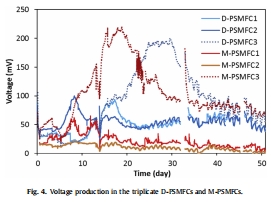 中層陽(yáng)極(M-PSMFC):初期電壓高,但隨根系生長(zhǎng)侵入陽(yáng)極后電壓下降,因氧氣直接接觸陽(yáng)極競(jìng)爭(zhēng)底物。