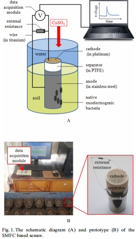 摘要指出,本研究開發了一種新型沉積物微生物燃料電池(SMFC)傳感器,用于在線、原位監測水中的銅離子沖擊。該傳感器將陽極插入淹沒土壤,陰極浸沒于上覆水中。當CuSO?溶液加入上覆水后,電壓信號在30秒內達到峰值,且電壓增量(峰值電壓-基線電壓)與Cu2?濃度(最高160 mg/L)呈線性關系。Cu2?沖擊降低了陰極電荷轉移電阻(Rct),但對陽極Rct無影響。高濃度Cu2?(320 mg/L)雖抑制表層土壤(0–3 cm)中地桿菌和梭菌的豐度與活性,但不影響深層土壤中的產電菌,且基線電壓保持穩定。結果表明,該傳感器通過促進陰極反應(而非抑制產電菌)實現Cu2?的快速檢測。