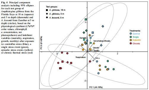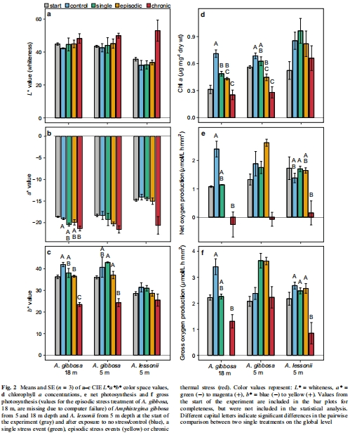 研究意義:光合作用抑制表明熱應力損害共生體功能;A. lessonii的較高保留顯示共生體效率更好。