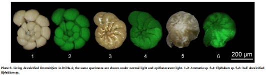 研究意義:這些數據直接展示了生物對環境梯度的響應。密度和豐富度從斯卡格拉克(最高)向波羅的海(最低)遞減。每個站點都有其標志性物種,反映了不同的環境適應策略(如斯卡格拉克的C. laevigata和 H. balthica,卡特加特和厄勒海峽的N. aff. stella和 S. fusiformis)。最關鍵的發現是,在波羅的海站點,優勢種Ammoniaspp. 和 Elphidiumspp. 的鈣質殼出現部分至完全溶解,僅剩下有機內襯,但其CTG標記顯示它們仍然是活體(Plate 3)。這證明了在多重壓力下,有孔蟲可能犧牲鈣質殼以維持生命活動。