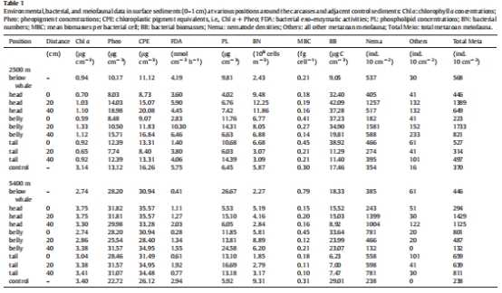 數(shù)據(jù):包括沉積物中的葉綠素a、脫鎂葉綠素(指示 phytodetrital matter)、磷脂(指示總微生物生物量)、細(xì)菌數(shù)量、細(xì)菌生物量以及細(xì)菌外酶活性(FDA)。