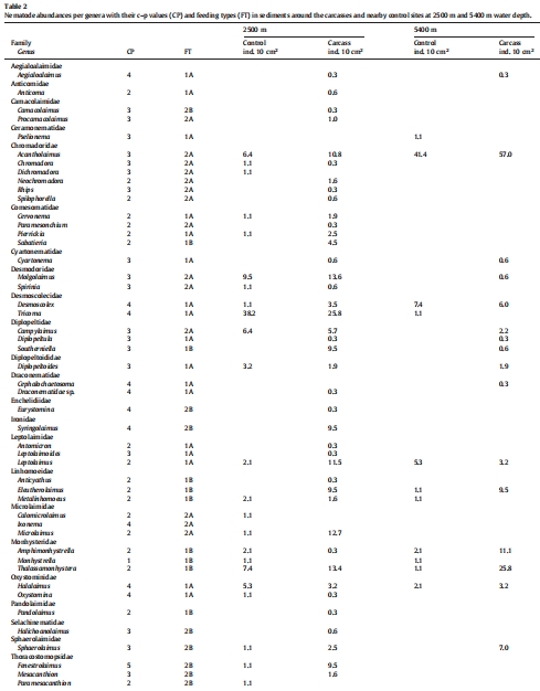 食物沉降會(huì)導(dǎo)致其附近區(qū)域的小型底棲動(dòng)物/線蟲(chóng)密度增加。