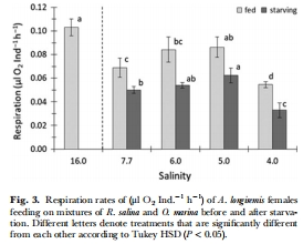 研究意義:這是本研究最關(guān)鍵的發(fā)現(xiàn)之一。即使在最適鹽度(7-16)下,A. longiremis的呼吸速率也異常高,并且在鹽度5時(shí)再次升高。這表明維持體內(nèi)滲透平衡是一個(gè)持續(xù)消耗能量的過程,揭示了其耐受性背后的生理代價(jià)。