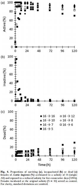 數(shù)據(jù):記錄了雌性在突然暴露于不同鹽度后120小時(shí)內(nèi)的存活、失活和死亡比例,并計(jì)算了死亡率。