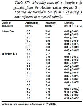 自然種群比較:從波羅的海西部?jī)蓚€(gè)不同鹽度的海域(阿爾科納海,鹽度14.5-16.4;博恩霍爾姆海盆地,鹽度7.7-7.9)采集A. longiremis成體,在實(shí)驗(yàn)室條件下比較它們?cè)诟髯栽}度下的生理表現(xiàn)。