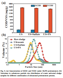 數據:高US密度(12 W/mL)下,US+PS預處理導致小顆粒(0.1-0.5μm)消失,SCOD和TCOD減少(COD損失25.7%)。