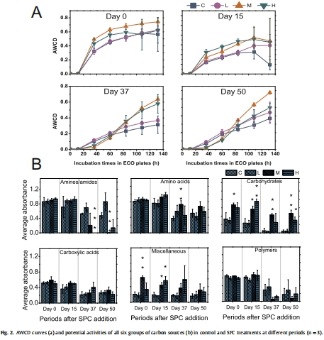 功能微生物增加:發酵、尿素分解、化學異養微生物增長,表明SPC提供電子受體和供體。