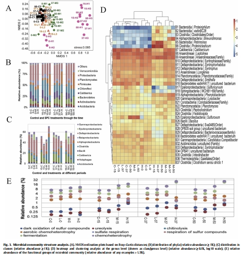 Fig. 3E顯示發酵、化學異養等功能組增加。Table 1顯示高劑量SPC降低Chao-1和Shannon指數。
