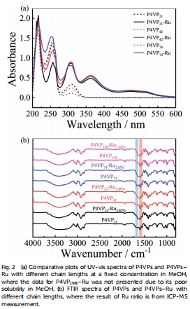 數據:FTIR顯示P4VP-Ru在1650 cm?1出現羧酸酯特征峰(bda引入);UV-vis顯示P4VP-Ru在350-400 nm和450-550 nm新增吸收帶(Ru(II)特征);NMR顯示芳香/脂肪質子比(Aaro/Aali)增加;ICP-MS測得Ru負載量~2.8-3.5 wt%。